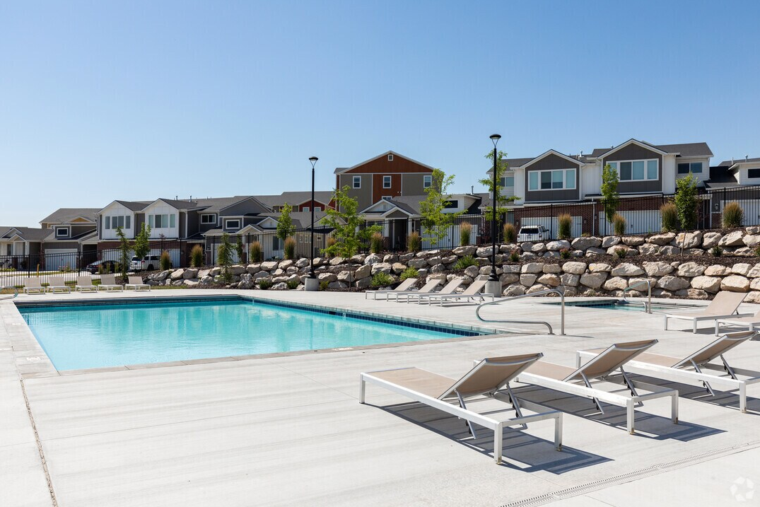 Rose Canyon Townhomes in Herriman, UT. The homes include open floor plans, featuring 9 foot ceilings and over sized picture windows, that allow for plenty of natural light and an airy feel. These beautiful town homes feature hardwood or tile floors in nearly all high-traffic areas of the home including the kitchen, entryway, dining room, hallways, and mud room. Each home’s luxurious master suite features vaulted ceilings, and comes complete with master bathrooms featuring custom made cabinets, quartz tops, washer dryer, stainless steel appliances, two car garage, private patio, decks. walk out basements on select units. You will fall in love with the beautiful mountain views, while you enjoy the pool, hot tub, pickle ball court, basketball court. This property has easy freeway and light rail access. We are close to shopping, restaurants, parks, schools and much more!
